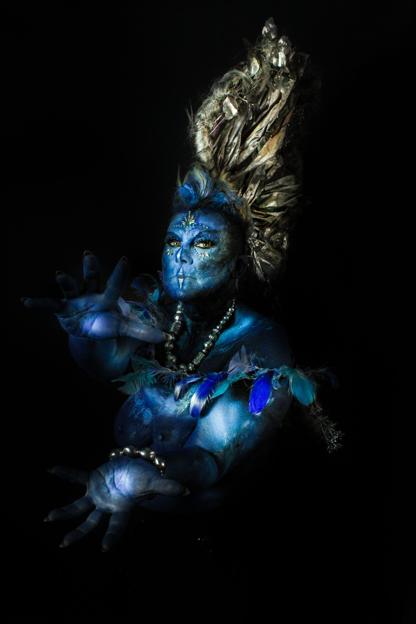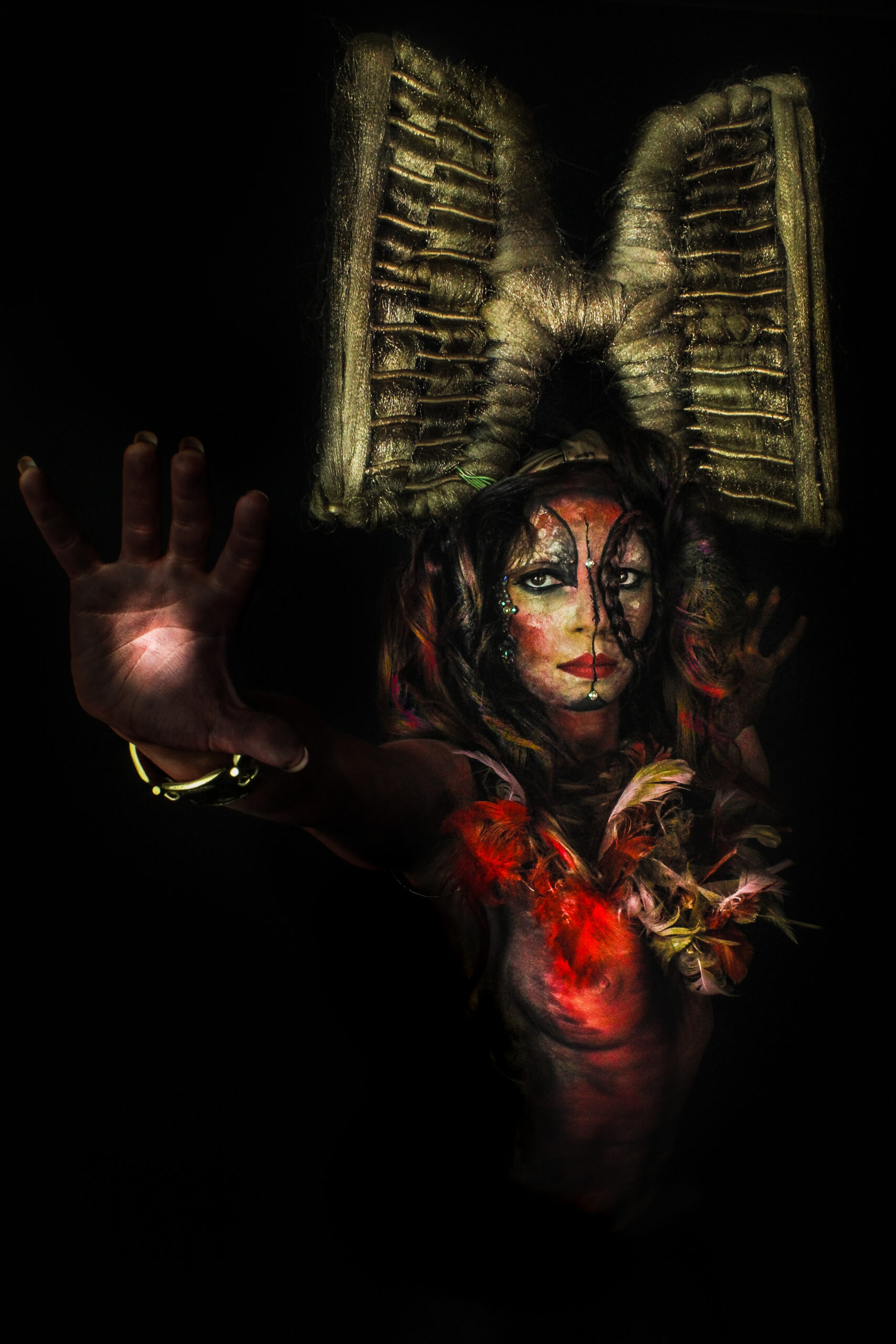 Elle intègre la peinture sur corps, la sculpture, la création d’ornements de plumes, capillaires et de bijoux, le tout mis en lumière à travers la photographie de ces femmes portant ces créations.